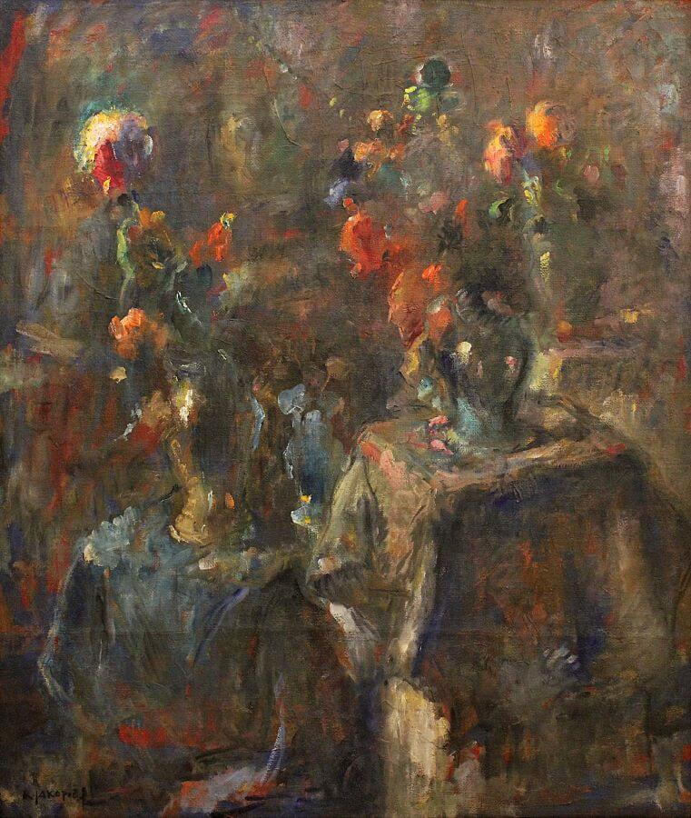 Rihard Jakopič (Ljubljana 1869 - Ljubljana 1943) je osrednja osebnost slovenske umetnosti, saj o njej kot takšni resnično lahko govorimo šele z nastopom modernizma, ko je ideja  slovenske umetnosti postala programska stalnica, Jakopič pa njen neuradni strateg. V družini podjetnega trnovskega pridelovalca zelenjave z obilo trgovskega čuta se je našel denar tudi za njegovo slikarsko izobraževanje. Začel je leta 1887 na Dunaju pri profesorju Franzu Rumplerju, končal dva letnika, nato leta 1890 vpisal minhensko akademijo, a je kmalu študij opustil in se ob Antonu Ažbetu in Ferdu Veselu začel izpopolnjevati zunaj institucionalnih okvirjev. Njegov študij je ves čas ovirala bolezen. Ob ustanavljanju Slovenskega umetniškega društva leta 1899, katerega tajnik je postal, se je za nekaj časa ustalil v Ljubljani, po polomu druge razstave dve leti pozneje pa se je preselil k svoji zaročenki Ani Czerny v Škofjo Loko. Leta 1903 je en semester delal v Pragi pri Vojtechu Hynaisu. V Ljubljano je dokončno prišel leta 1906, leta 1909 zgradil Jakopičev paviljon na svoje stroške, ga odprl s tretjo razstavo neformalno obujenega umetniškega društva in vse do srede dvajsetih let je organiziral in vodil umetnostno življenje v mestu. S Sternenom je v letih 1907-1914 organiziral umetnostno šolo, a jo je kmalu vodil sam. Bil je med ustanovniki Narodne galerije in Slovenske akademije znanosti in umetnosti. Doslej je evidentiranih nad tisoč dvesto Jakopičevih slik in skic. Njegov slog se je oblikoval v minhenskem okolju med salonskim realizmom in sodobnimi tendencami. Pred koncem desetletja se je začel obračati h krajini, v kateri je opaziti prve znake impresionistične tehnike, vendar podrejene lokalnim secesijskim prijemom. Po prelomu stoletij je do l. 1904 skupaj z Groharjem, Jamo in Sternenom zgradil aparat slovenskega impresionizma, kot je sam zapisal. V letih 1905-06 se je vizualni izkušnji pridružilo bolj izrazno doživljanje. Tedaj so nastale številne v osebne vizije prelite upodobitve interierjev, hkrati pa vrsta sijajnih krajin. Do leta 1912 je podobe vidnega sveta transponiral v postimpresionistične barvne harmonije, v katerih se je do leta 1917 razdeljena paleta umaknila lirični barvni ubranosti odločnejših potez. Po prvi svetovni vojni je njegovi izraz postajal vse bolj ekspresiven, reka Sava v izbranem območju med Tacnom in Črnučami se je pojavila kot vodilni motiv, pogosto pa je za zadovoljevanje naročniških želja ponavljal predvojne teme, še posebej motive brez in dela na polju. Zadnje desetletje je minilo v meditacijah ob vizionarno-ekspresivnih cvetličnih tihožitjih in ob temah, izvedenih iz fresk v veži stanovanjskega kompleksa Meksike v šempeterskem predmestju, ki jih je risal v pastelni tehniki.